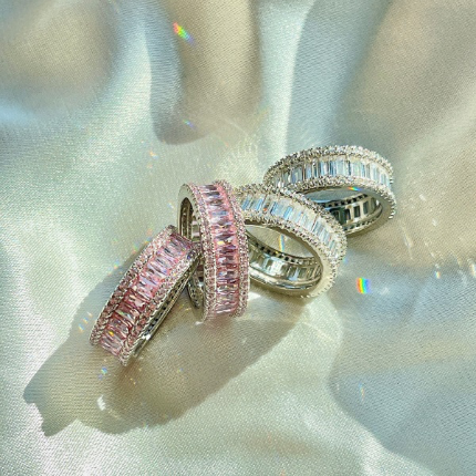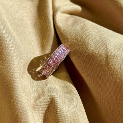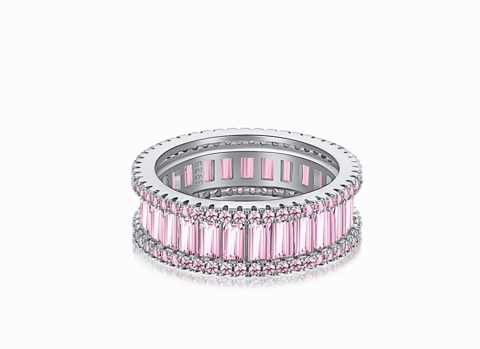 Sterling silver eternity ring with emerald cut pink stones