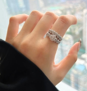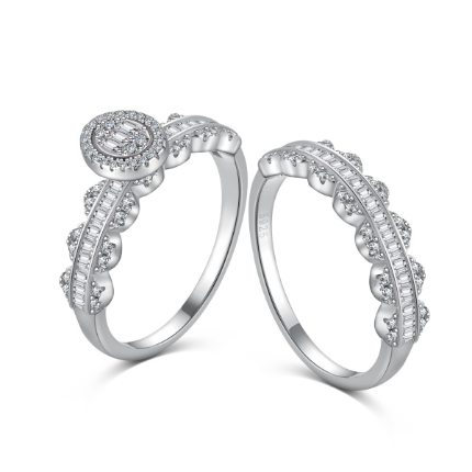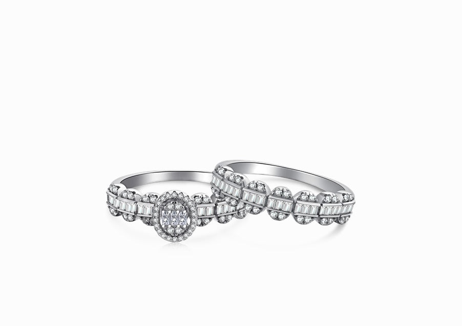 Sterling silver set, Baguette style Grade 5A stones and main ring has a risen oval baguette and pavé styled centre